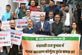 शिमला: हिमाचल प्रदेश विधानसभा के बाहर पंचायत चुनाव के रोस्टर में किए गए...