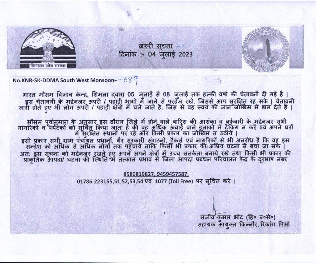 हिमाचल : प्रदेश में पांच दिन भारी बारिश का अलर्ट जारी किया गया है। मौसम विज्ञान केंद्र शिमला के अनुसार प्रदेश के कई भागों में 10 जुलाई तक बारिश जारी रहने के आसार हैं। 4,5,6,7 व 8 जुलाई के लिए राज्य में भारी बारिश व अंधड़ चलने का अलर्ट जारी किया गया है। विभाग ने पर्यटकों व स्थानीय लोगों को संबंधित विभागों की ओर से मौसम को लेकर जारी एडवाइजरी व दिशा-निर्देशों का पालन करने का आग्रह किया है।