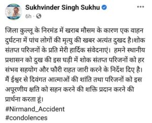 हिमाचल: प्रदेश के कुल्लू जिले में पुलिस थाना निरमंड के तहत आने वाली देवढांक-केदस सड़क पर सोमवार सुबह एक कार गहरी खाई में गिरने से पांच लोगों की मौत हो गई है। इनमें से चार की मौके पर ही मौत हो गई, जबकि गंभीर रूप से घायल चालक ने अस्पताल ले जाते समय दम तोड़ दिया। जानकारी के मुताबिक सोमवार सुबह एक मारुति कार संख्या एचपी35-4332 देवढांक से केदस गांव की ओर जा रही थी। कार जब ओडीधार पहुंची तो अनियंत्रित होकर सड़क से नीचे गहरी खाई में जा गिरी। हादसे की सूचना मिलते ही स्थानीय लोग घटनास्थल की ओर रवाना हुए और पुलिस को भी सूचना दी। खराब मौसम और बारिश के बीच बचाव अभियान चलाकर कड़ी मशक्कत के बाद चार लोगों के शवों और घायल चालक को खाई से बाहर निकाला। इस हादसे में हरदयाल (65), गांव केदस तहसील निरमंड, रंजना (47) पत्नी गणेश नेगी, गांव नोगली रामपुर, वर्षा (37) पत्नी कुलदीप, गांव केदस निरमंड और नारायण शर्मा (70), गांव नावा निरमंड की मौके पर ही मौत हो गई। वहीं, हादसे में गंभीर रूप से घायल हुए चालक कुलदीप (40) पुत्र हरदयाल, गांव केदस निरमंड ने खनेरी अस्पताल ले जाते समय रास्ते में दम तोड़ दिया। पुलिस ने मृतकों का पोस्टमार्टम कर शव परिजनों को सौंप दिए हैं। पुलिस ने मामला दर्जकर हादसे के कारणों जांच में शुरू कर दी है।