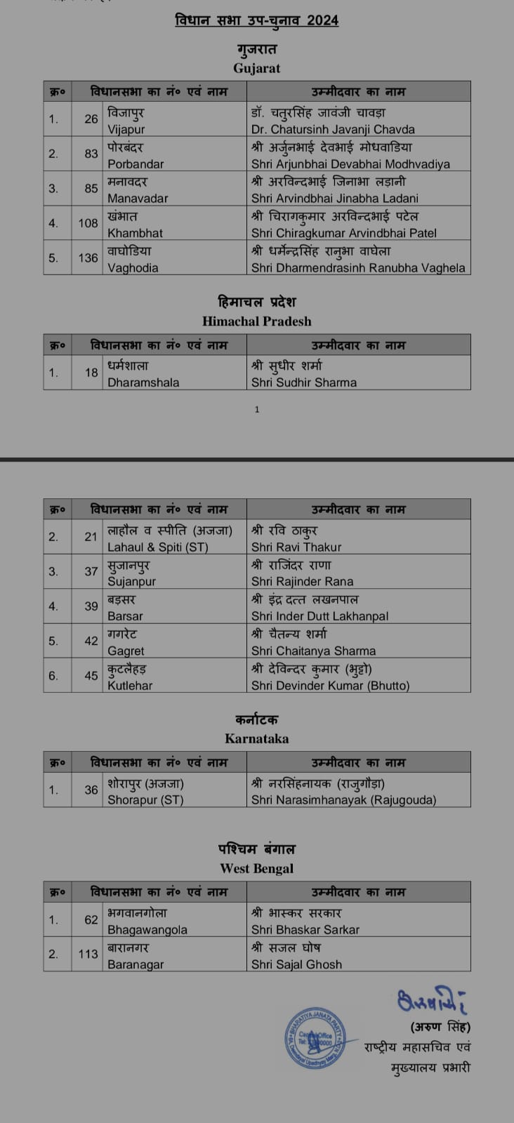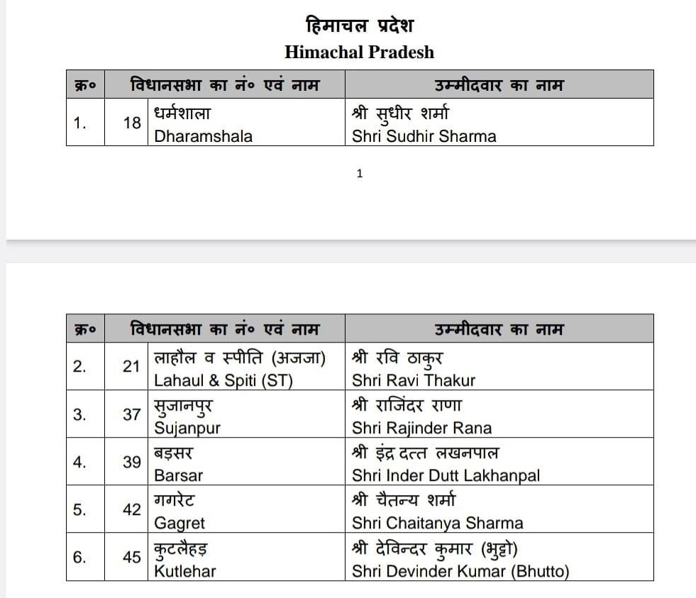 शिमला: भारतीय जनता पार्टी की केंद्रीय चुनाव समिति ने हिमाचल प्रदेश की छह विधानसभा सीटों पर लोकसभा चुनाव के साथ होने वाले उपचुनाव के लिए प्रत्याशियों की घोषित कर दी है। भाजपा ने कांग्रेस के सभी बागियों को टिकट दिए हैं।