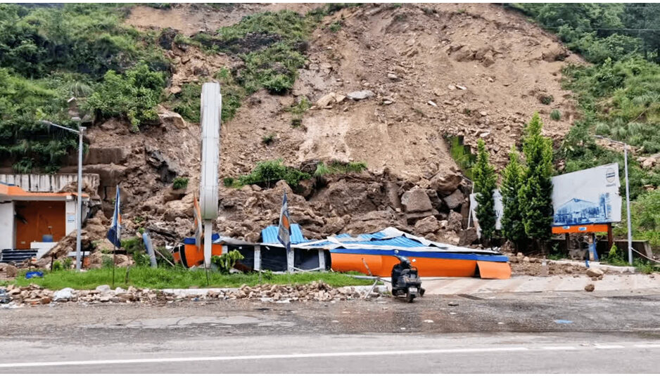 मण्डी जिले में दरकी पहाड़ी, मलबे में दबा पेट्रोल पंप..