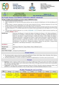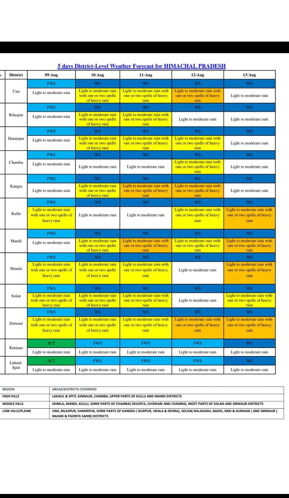 11 से 14 अगस्त तक राज्य के कई हिस्सों में भारी से बहुत भारी बारिश के लिए ऑरेंज अलर्ट जारी किया है। इससे 10 जिलों ऊना, बिलासपुर, चंबा, हमीरपुर, कांगड़ा, कुल्लू, मंडी, शिमला, सिरमौर और सोलन जिलों के कुछ इलाकों में भारी बारिश की आशंका जताई गई है।