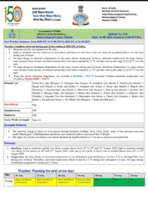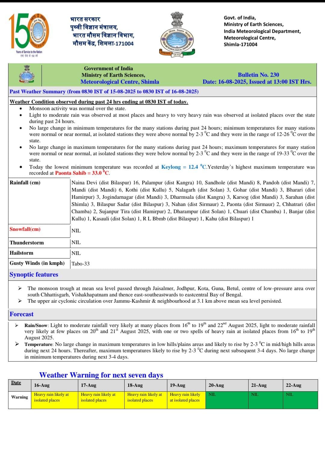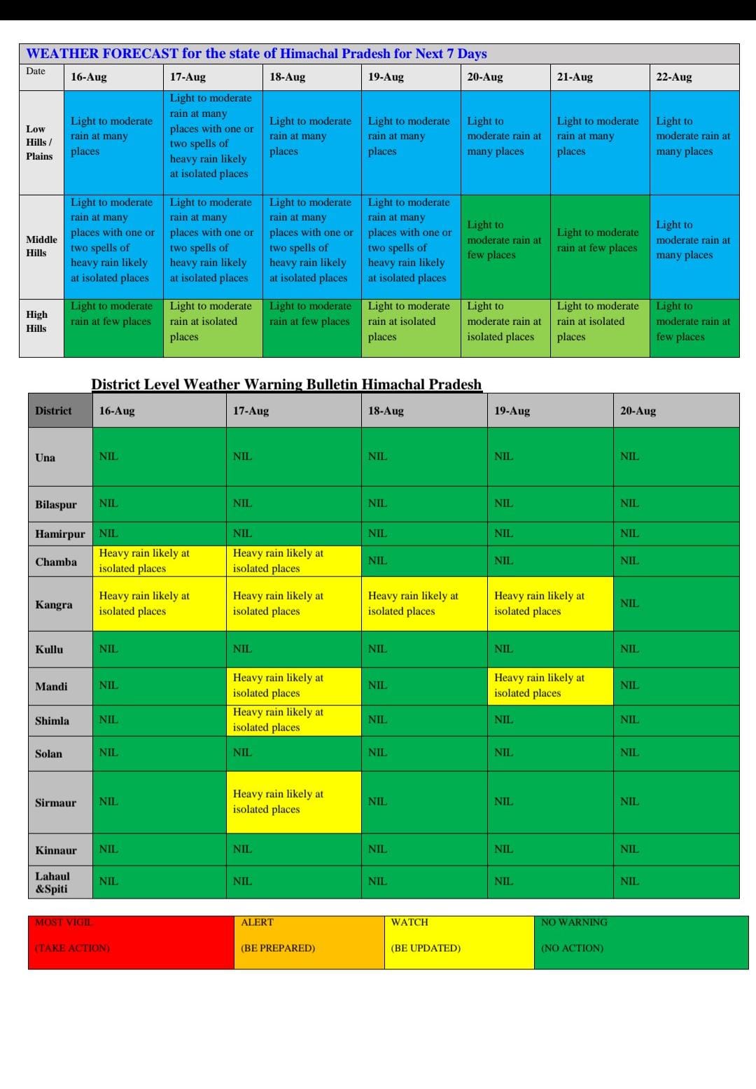 हिमाचल: प्रदेश में अब मानसून के कमजोर पड़ने की संभावना जताई जा रही है। प्रदेश में 17 अगस्त को मैदानी और माध्यम ऊंचाई वाले क्षेत्रों में कई स्थानों पर बारिश हो सकती है। इस दौरान चंबा, कांगड़ा, मंडी, शिमला और सिरमौर जिला में एक या दो स्थानों पर भारी बारिश होने का येलो अलर्ट जारी किया गया है। ऊंचाई वाले क्षेत्रों में कुछेक स्थानों पर ही बारिश की संभावना जताई गई है। 18 अगस्त को मैदानी और मध्यम ऊंचाई वाले कई क्षेत्रों के बारिश हो सकती है। इस दौरान कांगड़ा जिला में एक या दो स्थानों पर भारी बारिश का येलो अलर्ट है। वहीं ऊंचाई वाले क्षेत्रों में भी कुछ स्थानों पर बारिश हो सकती हैं। प्रदेश में 19 अगस्त को मैदानी और मध्यम ऊंचाई वाले क्षेत्रों में कई स्थानों पर बारिश होने के आसार हैं। इस दौरान कांगड़ा और मंडी जिला में एक या दो स्थानों पर भारी बारिश का येलो अलर्ट जारी किया गया है। ऊंचाई वाले क्षेत्रों में कुछेक स्थानों पर बारिश होने की संभावना है।