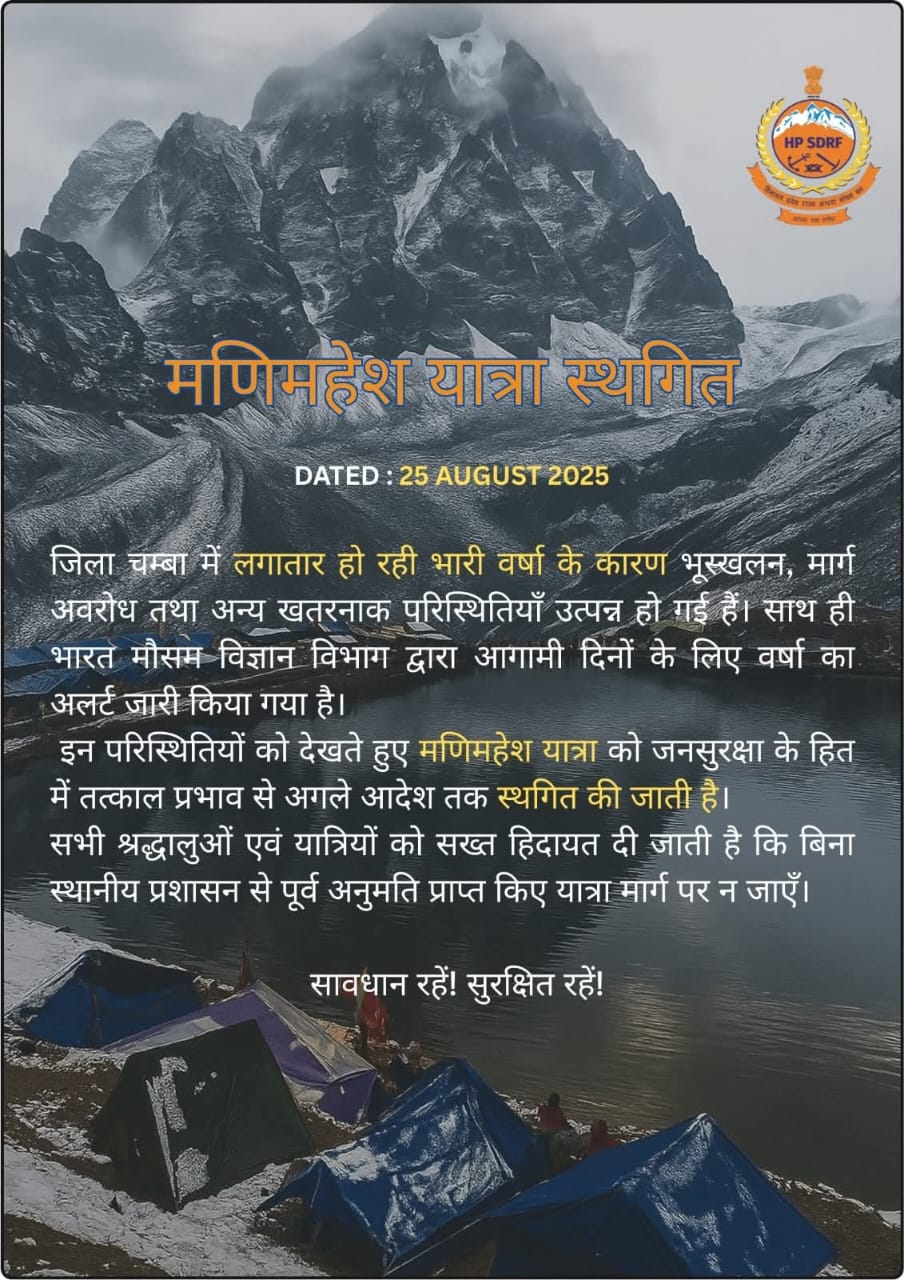 एडीएम भरमौर कुलबीर सिंह राणा ने जानकारी देते हुए बताया कि जिला चम्बा में लगातार हो रही भारी वर्षा के कारण भूस्खलन, मार्ग अवरोध तथा अन्य खतरनाक परिस्थितियाँ उत्पन्न हो गई हैं। साथ ही मौसम विज्ञान विभाग द्वारा आगामी दिनों के लिए वर्षा का अलर्ट जारी किया गया है। इन परिस्थितियों को देखते हुए मणिमहेश यात्रा को जनसुरक्षा के हित में तत्काल प्रभाव से अगले आदेश तक स्थगित कर दी गई है। उन्होंने कहा कि सभी श्रद्धालुओं एवं यात्रियों को सख्त हिदायत दी जाती है कि बिना स्थानीय प्रशासन से पूर्व अनुमति प्राप्त किए यात्रा मार्ग पर न जाएँ।
