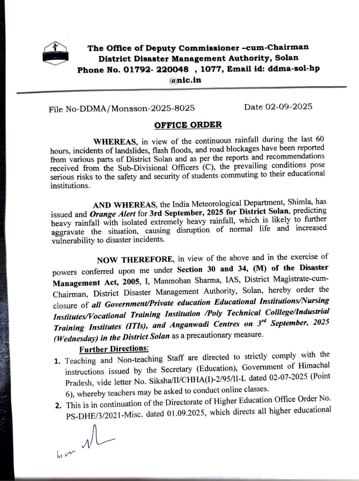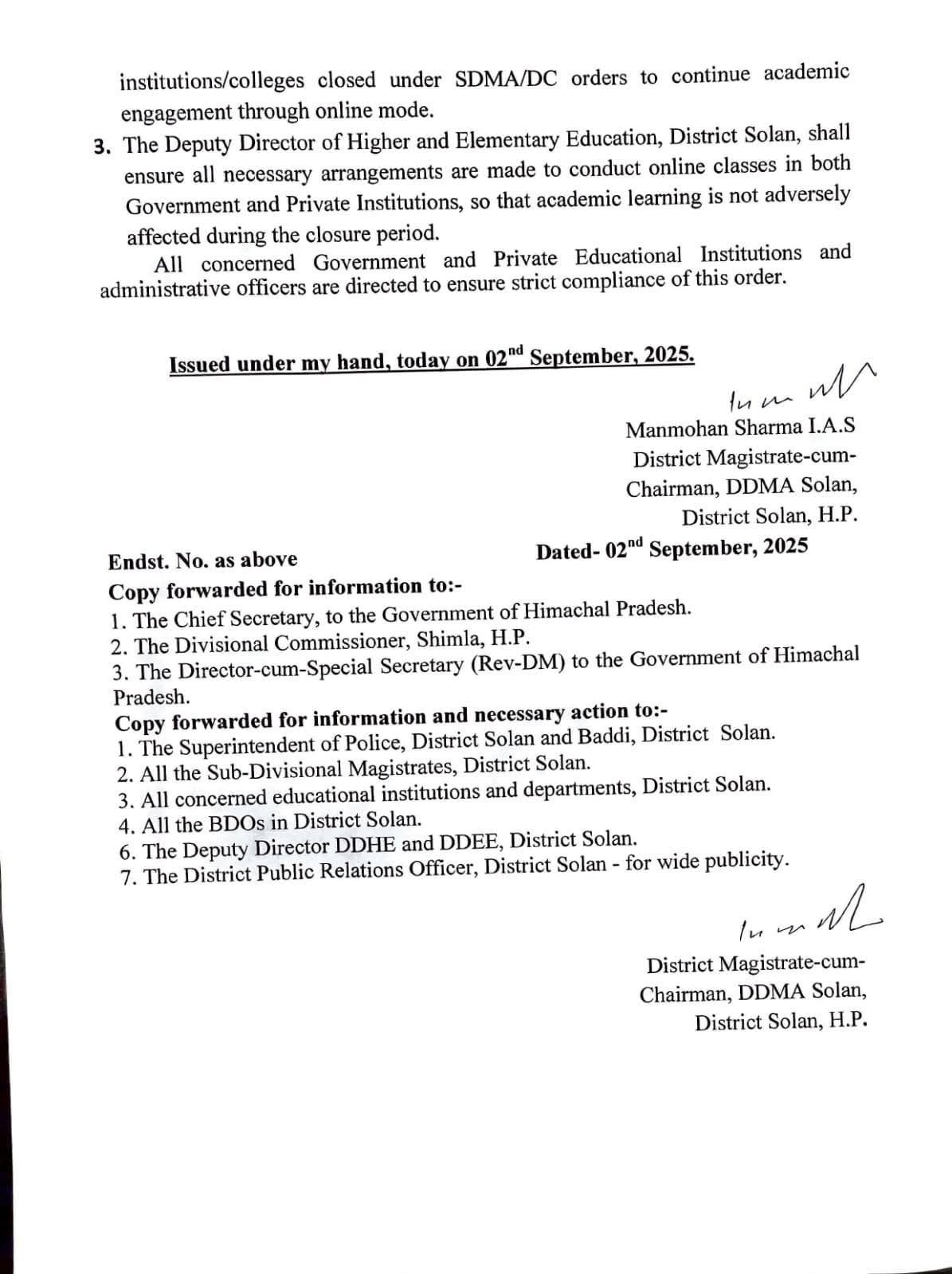 सोलन जिला में भी कल 3 सितंबर को सभी शिक्षण संस्थान रहेंगे बंद; आदेश जारी