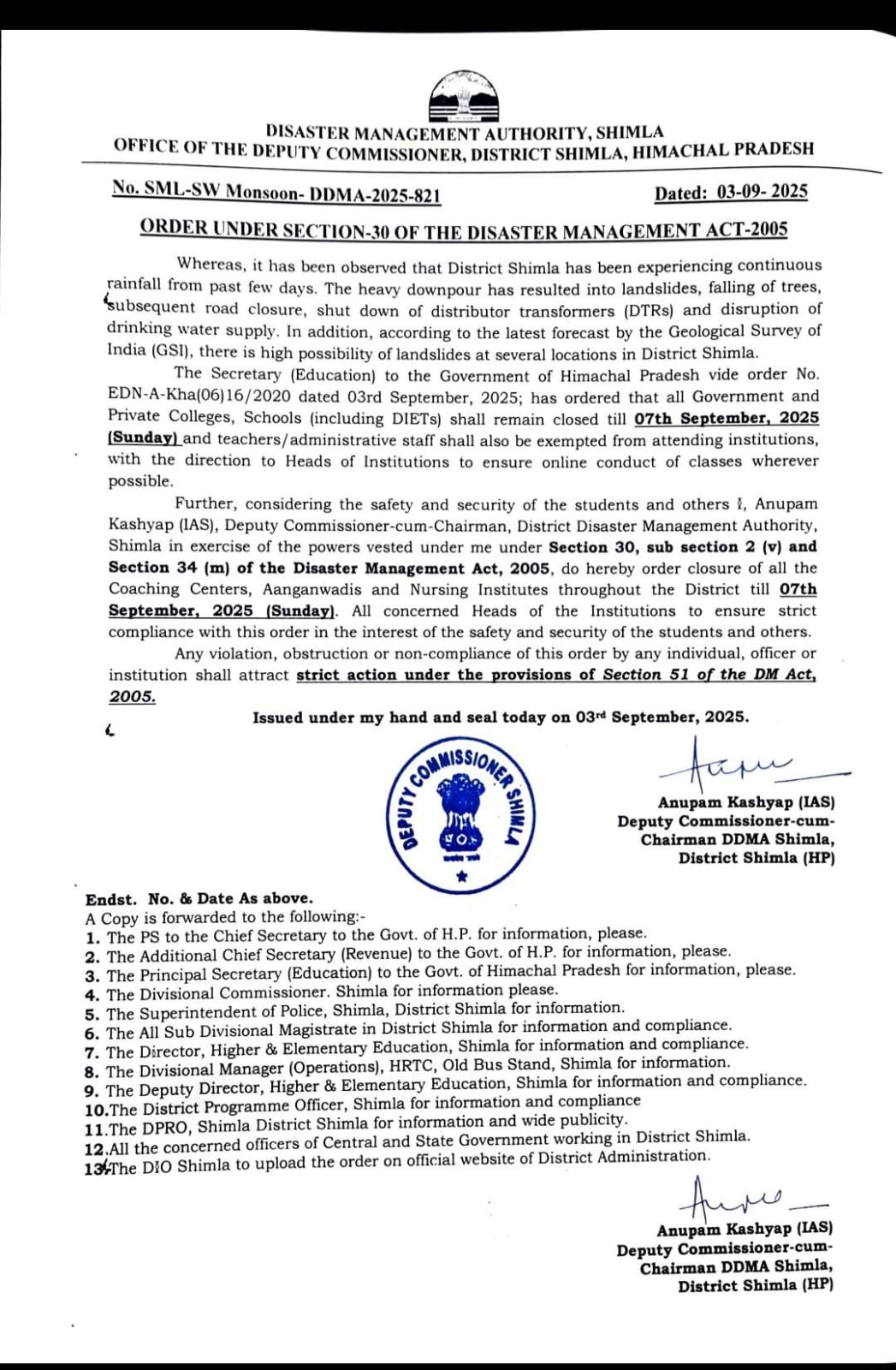 जिला शिमला में सभी आंगनवाड़ी केंद्र, कोचिंग संस्थान और नर्सिंग संस्थान 7 सितम्बर तक रहेंगे बंद ; आदेश जारी