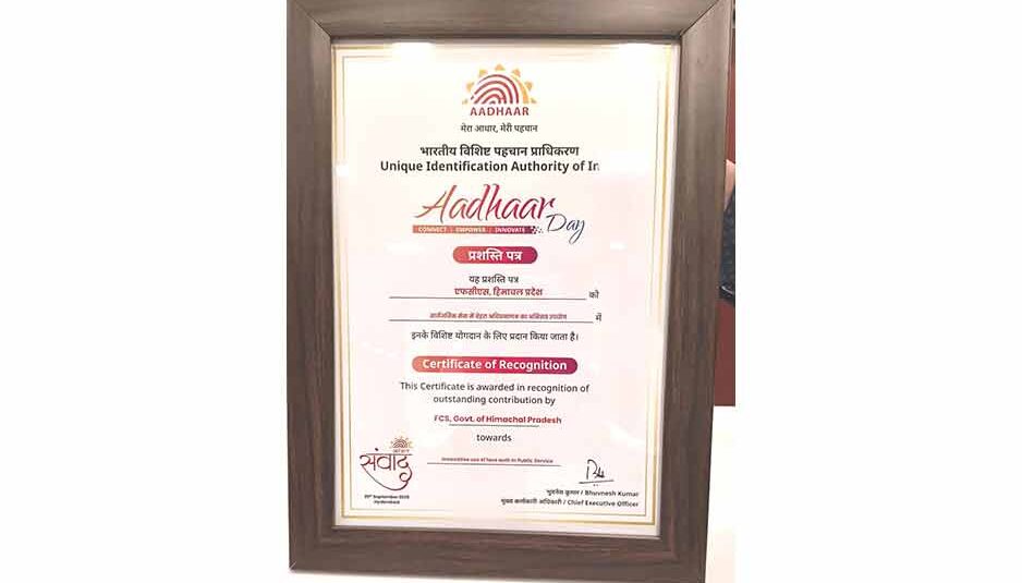 हिमाचल प्रदेश को आधार फेस ऑथेंटिकेशन नवाचार के लिए राष्ट्रीय सम्मान