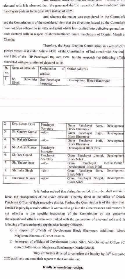 कर्मचारियों ने वर्ष 2025 की सूची के बजाय 2022 की सूची मतदाताओं के निरीक्षण के लिए उपलब्ध करवा दी। सूची में ग्राम पंचायत औरा, बजोल और होली में तैनात पंचायत सचिवों को निलंबित किया है, जबकि खंड विकास कार्यालय भरमौर में कार्यरत पंचायत उप निरीक्षक को भी निलंबित किया है। जिला पंचायत अधिकारी तिलक राज ने बताया कि इस संबंध में आदेश मिले हैं। मतदाता सूची कार्यों में इन कर्मचारियों ने लापरवाही बरती है। इनके मुख्यालय जिला पंचायत अधिकारी कार्यालय तय कर दिए हैं। इसी तरह पंचायत निरीक्षक निहरी के अलावा झुंगी, बेहली, बाई और शेगल पंचायत के सचिवों को भी निलंबित कर दिया गया है।