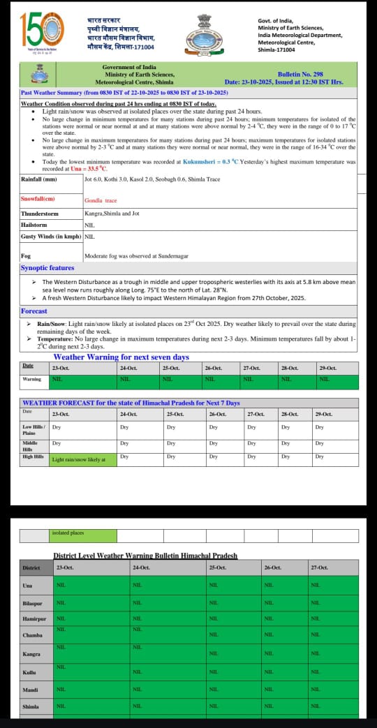 हिमाचल: प्रदेश में मौसम के करवट बदलते ही आज कई स्थानों में बारिश; ओलावृष्टि और ऊंचाई वाले क्षेत्रों में बर्फबारी हुई। कुल्लू की गड़सा घाटी में ओलावृष्टि हुई है। उधर, लाहौल घाटी के कोकसर में बर्फ देखने के लिए बड़ी संख्या में पर्यटक पहुंचे। गुरुवार को रोहतांग में सैलानियों ने बर्फ के फाहों का आनंद लिया। गुरुवार को रोहतांग दर्रा सैलानियों के लिए खुल गया है। धर्मशाला, शिमला और मण्डी जिले के कई भागों में बारिश हुई है। 24 से 29 अक्तूबर तक पूरे प्रदेश में माैसम साफ रहने के आसार हैं। हालांकि, 27 अक्तूबर को एक नए पश्चिमी विक्षोभ के पश्चिमी हिमालयी क्षेत्र को प्रभावित करने की संभावना है। इसके प्रभाव से राज्य के कई भागों में बारिश-बर्फबारी हो सकती है। वहीं अगले 2-3 दिनों के दौरान अधिकतम तापमान में कोई बड़ा बदलाव नहीं होगा।
