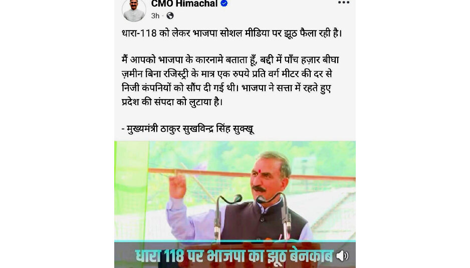 शिमला: मुख्यमंत्री ठाकुर सुखविन्द्र सिंह सुक्खू बोले- मैं आपको भाजपा के कारनामे बताता हूँ, बद्दी में पाँच हज़ार बीघा ज़मीन बिना रजिस्ट्री के मात्र एक रुपये प्रति वर्ग मीटर की दर से निजी कंपनियों को सौंप दी गई थी। भाजपा ने सत्ता में रहते हुए प्रदेश की संपदा को लुटाया है।