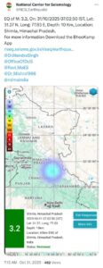 हिमाचल: राजधानी शिमला में शुक्रवार सुबह भूकंप के हल्के झटके महसूस किए गए । भूकंप सुबह 7 बजकर 2 मिनट पर महसूस किया गया, जिसकी तीव्रता रिक्टर स्केल पर 3.2 दर्ज की गई । मौसम विज्ञान केंद्र शिमला के अनुसार, भूकंप का केंद्र शिमला जिले में 31.76 डिग्री उत्तरी अक्षांश और 77.83 डिग्री पूर्वी देशांतर पर स्थित था । इसकी गहराई जमीन की सतह से लगभग 10 किलोमीटर नीचे रही । किसी भी क्षेत्र से जान-माल के नुकसान की कोई सूचना नहीं मिली है ।