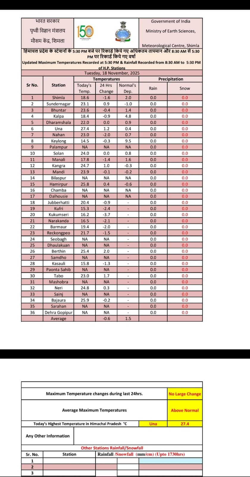 हिमाचल: प्रदेश में 24 नवंबर तक मौसम साफ हिमाचल: प्रदेश में 24 नवंबर तक मौसम साफ बना रहने का पूर्वानुमान है। मौसम विज्ञान केंद्र शिमला के अनुसार पूरे प्रदेश में 24 नवंबर तक मौसम साफ बना रहने का पूर्वानुमान है।