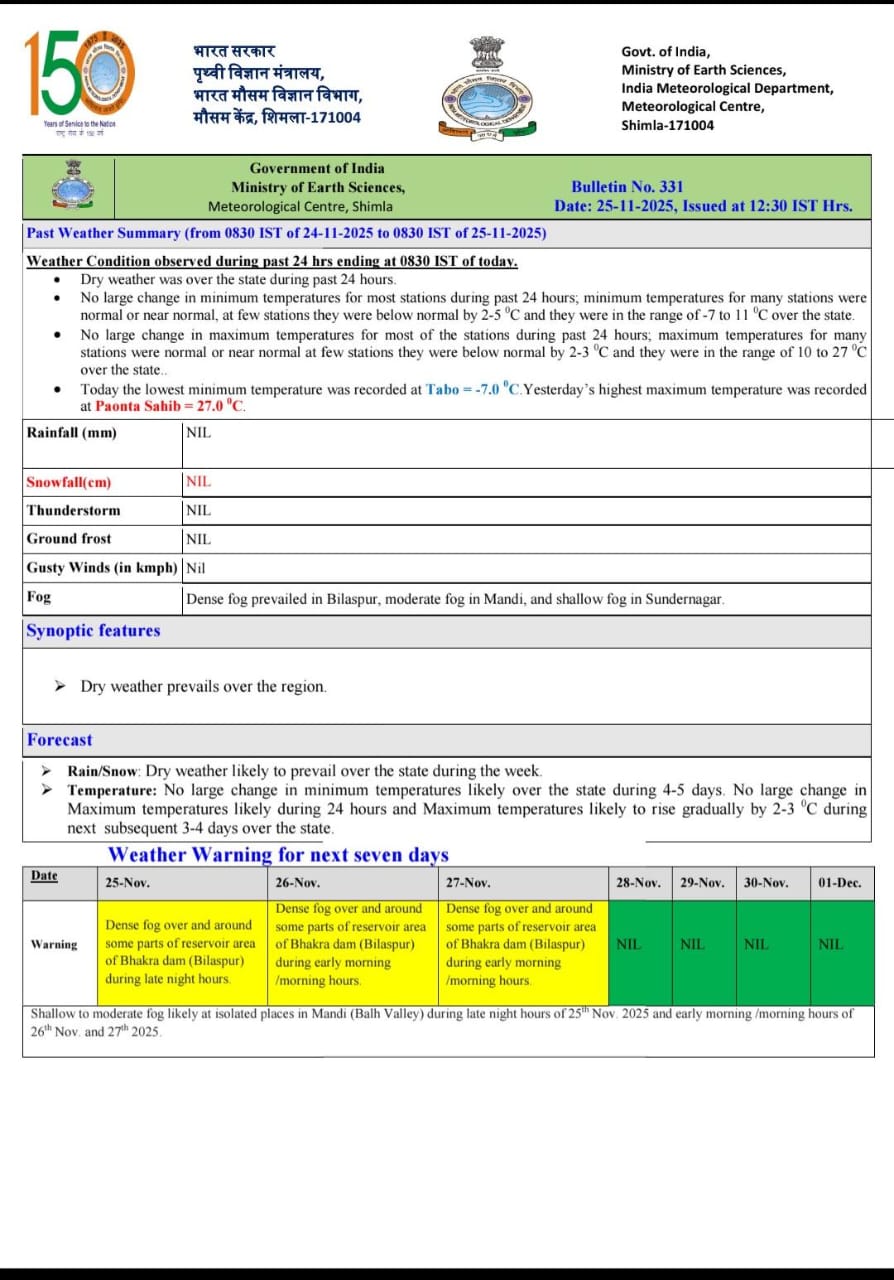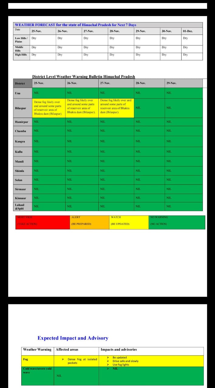 हिमाचल: प्रदेश में 1 दिसंबर तक मौसम साफ रहने की संभावना है। मौसम विज्ञान केंद्र शिमला के अनुसार, राज्य में 1 दिसंबर तक मौसम साफ रहेगा। वहीं देर रात व सुबह के समय भाखड़ा डैम (बिलासपुर) के जलाशय क्षेत्र के कुछ हिस्सों के ऊपर और आसपास 27 नवंबर तक घना कोहरा छाए रहने का येलो अलर्ट जारी किया गया है। इसी तरत मंडी जिले की बल्ह घाटी में भी कोहरा छाने की संभावना है।