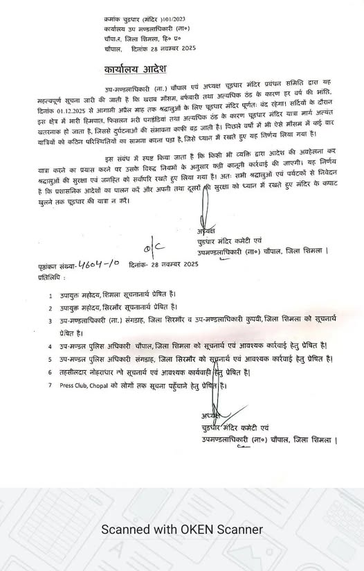 हिमाचल: चूड़धार यात्रा पर एक दिसंबर से पूरी तरह से प्रतिबंध लग जाएगा। यह प्रतिबंध अप्रैल तक जारी रहेगा। इस अवधि के दौरान यदि कोई यात्रा पर जाता है तो उसके खिलाफ प्रशासन कानूनी कार्रवाई करेगा। उपमंडलाधिकारी चौपाल हेम चंद वर्मा ने कहा श्रद्धालुओं की सुरक्षा और जन हित को देख कर प्रशासन ने कपाट बंद होने के बाद यह निर्णय लिया है। प्रतिबंध के बाद यदि कोई चूड़धार कर यात्रा पर निकला तो उसके खिलाफ कड़ी कार्रवाई की जाएगी।