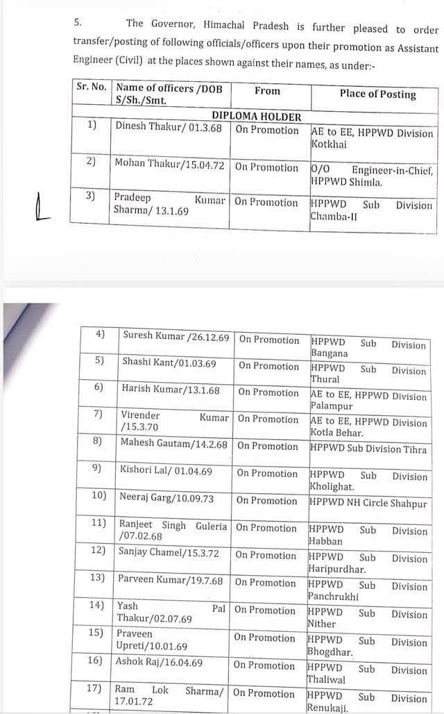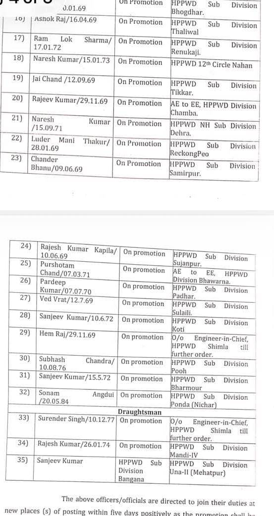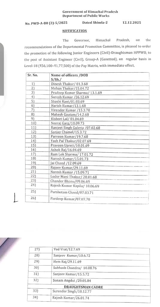 हिमाचल: PWD में 35 जूनियर इंजीनियर को मिली पदोन्नति..