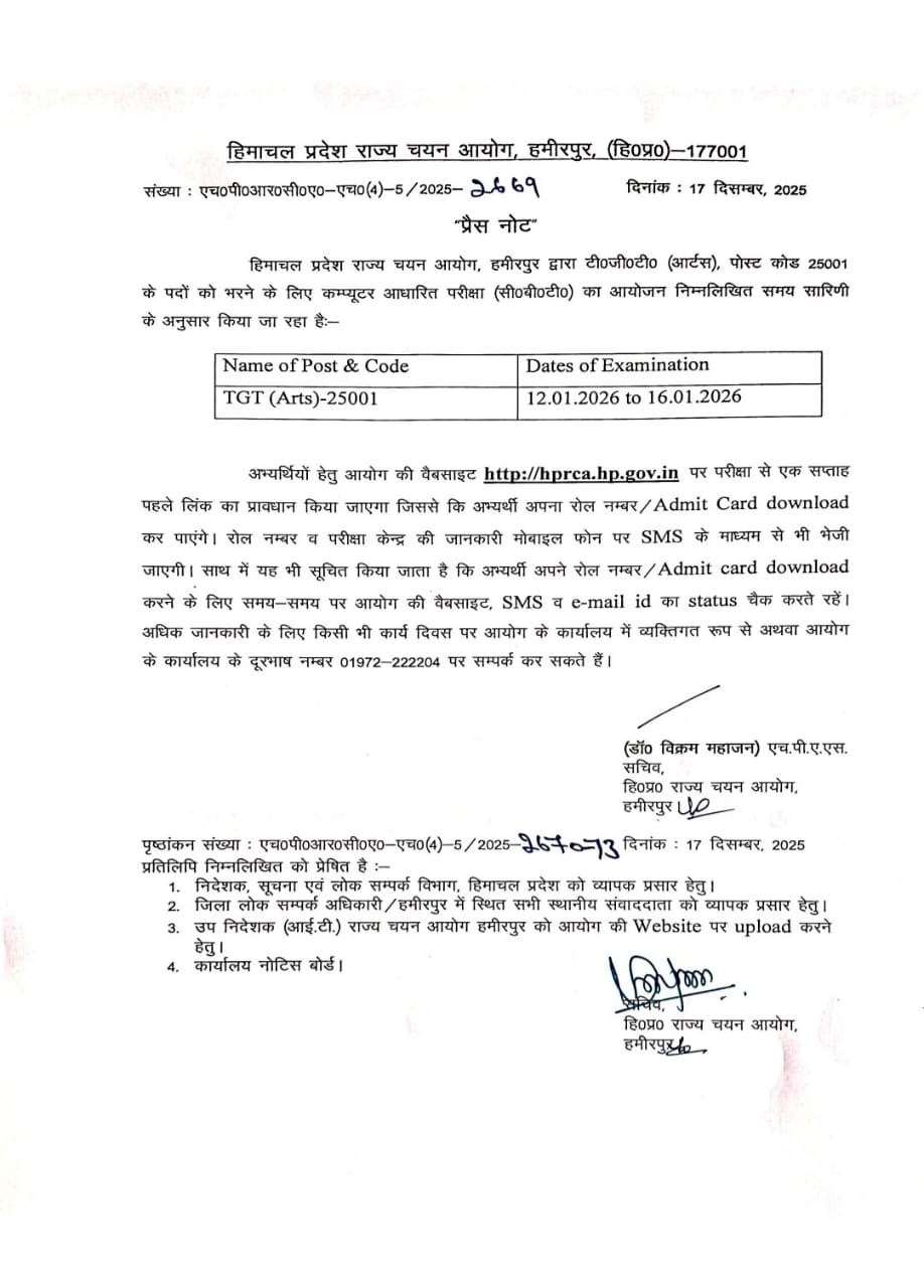 हिमाचल: TGT आर्ट्स की 12 से 16 जनवरी तक होगी परीक्षा..