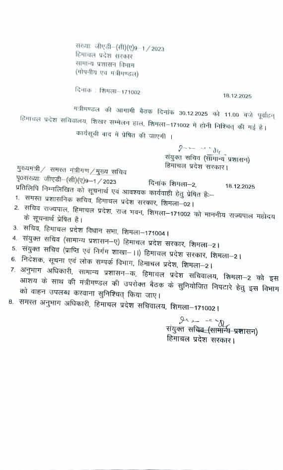 हिमाचल: 30 दिसंबर को प्रदेश कैबिनेट बैठक