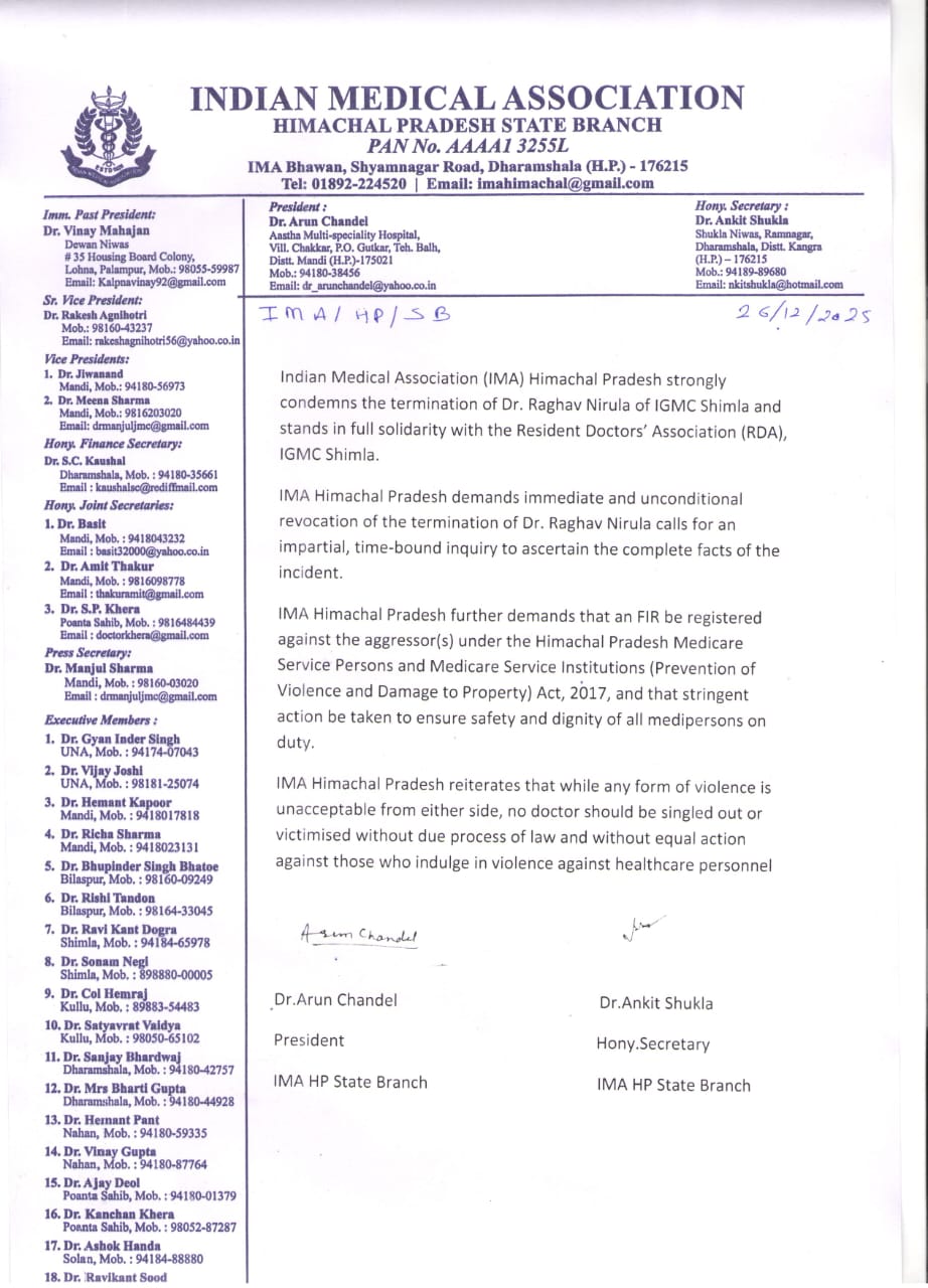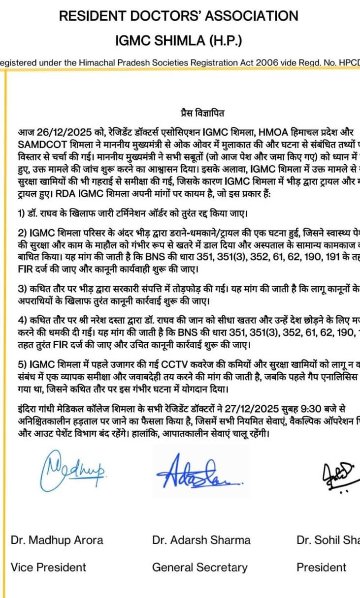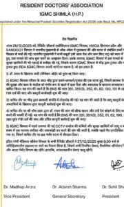 आरडीए आईजीएमसी शिमला ने अनिश्चितकालीन हड़ताल पर जाने के सम्बंध में आईजीएमसी कॉलेज प्रशासन को लिखित रूप से अवगत करा दिया है।