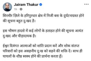 CM सुक्खू ने बस दुर्घटना में हुई मृत्यु पर जताया शोक