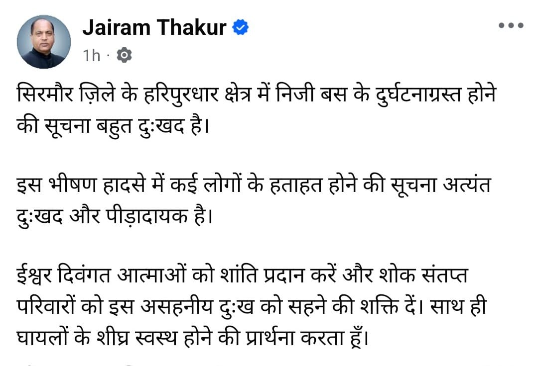 मुख्यमंत्री ठाकुर सुखविन्द्र सिंह सुक्खू ने आज सिरमौर ज़िला के हरिपुरधार के पास निजी बस (जीत कोच) दुर्घटना में हुई मानव क्षति पर गहरा शोक व्यक्त किया है। बस शिमला से कुपवी जा रही थी। यह बस हरिपुरधार से 100 मीटर पहले अनियंत्रित होकर लगभग 100 मीटर गहरी खाई में गिरी। अभी तक प्राप्त जानकारी के अनुसार बस में 45 लोग सवार थे, जिनमें से 12 यात्रियों की मौक़े पर मृत्यु हो गई, जबकि 33 गंभीर रूप से घायल व्यक्तियों को उपचार के लिए आईजीएमसी शिमला रैफर किया गया है।