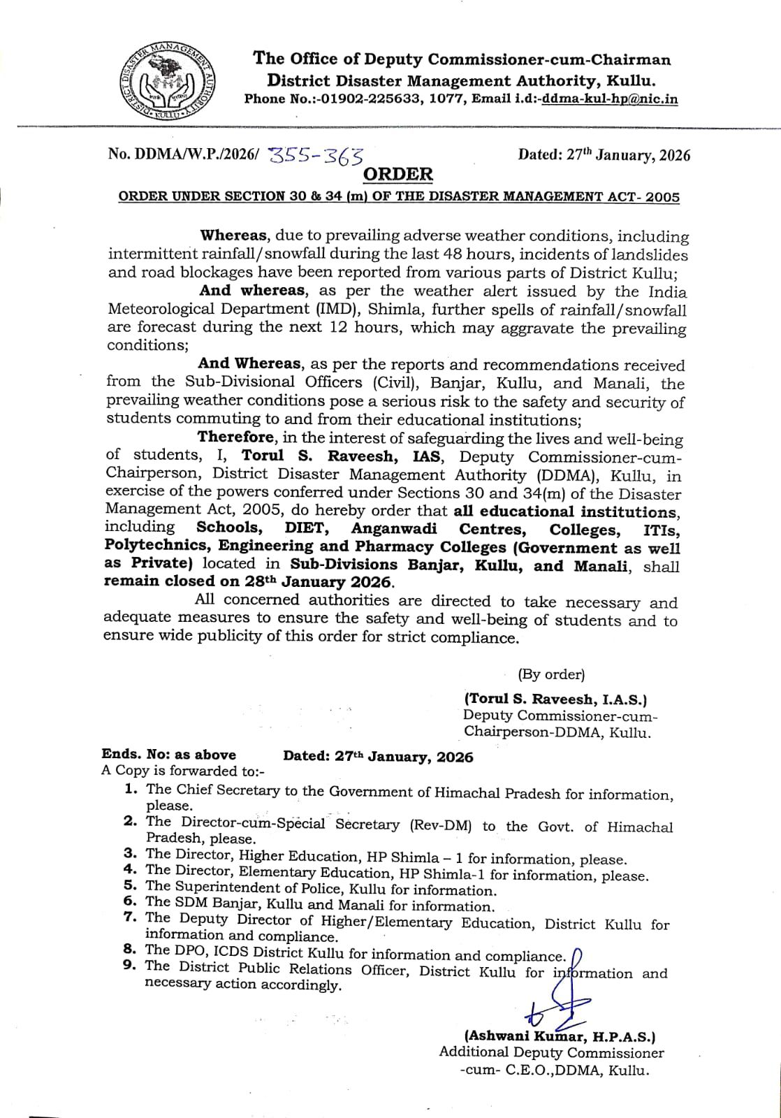 उप-मंडल अधिकारी (ना.) बंजार, कुल्लू एवं मनाली से प्राप्त रिपोर्टों एवं अनुशंसाओं के आधार पर विद्यार्थियों की सुरक्षा एवं संरक्षा को देखते हुए यह निर्णय लिया गया है। आदेशानुसार बंजार, कुल्लू एवं मनाली उपमंडलों में स्थित सभी विद्यालय, DIET, आंगनवाड़ी केंद्र, महाविद्यालय, आईटीआई, पॉलिटेक्निक, इंजीनियरिंग एवं फार्मेसी महाविद्यालय (सरकारी एवं निजी) 28 जनवरी 2026 को बंद रहेंगे।