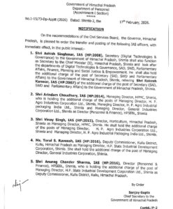 हिमाचल : प्रदेश में प्रशासनिक फेरबदल…