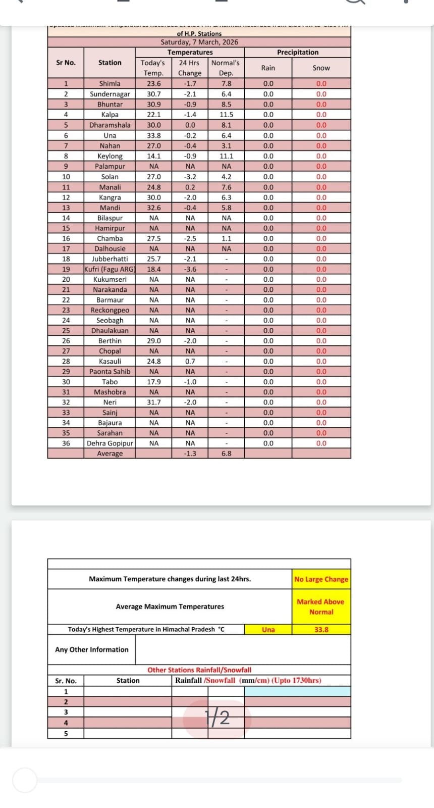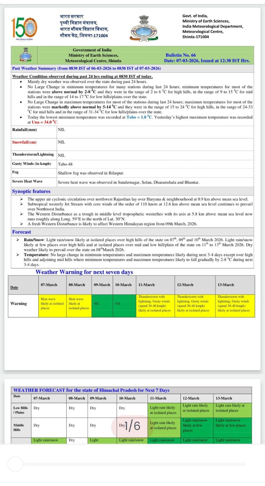 हिमाचल: प्रदेश में ऊंचाई वाले क्षेत्रों में मौसम के खराब होने की संभावना जताई जा रही है। पश्चिमी विक्षोभ की सक्रियता से राज्य के कई भागों में लगातार तीन दिन बारिश-बर्फबारी हो सकती हैं। वहीं लगातार मौसम साफ रहने से प्रदेश में गर्मी की तपिश बढ़ने लगी है । कांगड़ा, कुल्लू, मण्डी, सोलन जिले में 7 व 8 मार्च के लिए हीटवेव का येलो अलर्ट जारी किया गया है। मौसम विज्ञान केंद्र शिमला के अनुसार 7, 9 और 10 मार्च को राज्य के ऊंची चोटियों पर कुछ स्थानों पर हल्की बारिश-बर्फबारी हो सकती है। 11 से 13 मार्च तक राज्य के उच्च पर्वतीय और मध्य पर्वतीय क्षेत्रों में हल्की बारिश-बर्फबारी का पूर्वानुमान है। जबकि निचले पहाड़ी-मैदानी इलाकों में कुछ जगहों पर हल्की बारिश की संभावना है। 8 मार्च को पूरे प्रदेश में मौसम साफ रहने के आसार हैं।