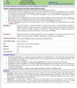 21 और 22 मार्च को राज्य के कुछ अलग-अलग स्थानों पर हल्की बारिश-बर्फबारी होने के आसार हैं। 17 मार्च को राज्य के कुछ स्थानों पर हल्की से मध्यम बारिश-बर्फबारी हो सकती है। जबकि 16 और 18 मार्च को राज्य के कई स्थानों पर हल्की से मध्यम बारिश-बर्फबारी होने की संभावना है। 19 मार्च को कुल्लू, कांगड़ा व चंबा जिले में भारी बारिश-बर्फबारी, जबकि चंबा, शिमला व सोलन में अंधड़ के साथ ओलावृष्टि का ऑरेंज अलर्ट जारी किया गया है।