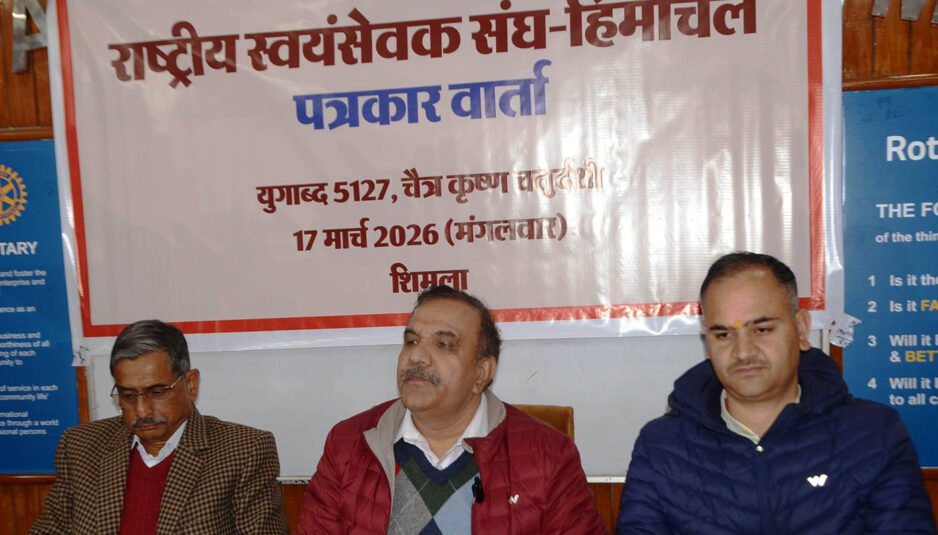 शिमला: अखिल भारतीय प्रतिनिधि सभा की तीन दिवसीय बैठक 13-15 मार्च 2026 को समालखा (पानीपत) में सम्पन्न हुई। शिमला में राष्ट्रीय स्वयंसेवक संघ हिमाचल प्रांत ने आज इस संदर्भ में प्रेसवार्ता आयोजित की गई। इस अवसर पर हिमाचल प्रांत के संघचालक डॉ. वीर सिंह रांगड़ा, विभाग संघचालक राजकुमार वर्मा और प्रांत प्रचार प्रमुख प्रताप समयाल जी विशेष रूप से उपस्थित रहे।