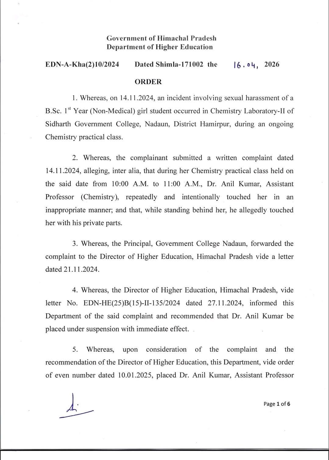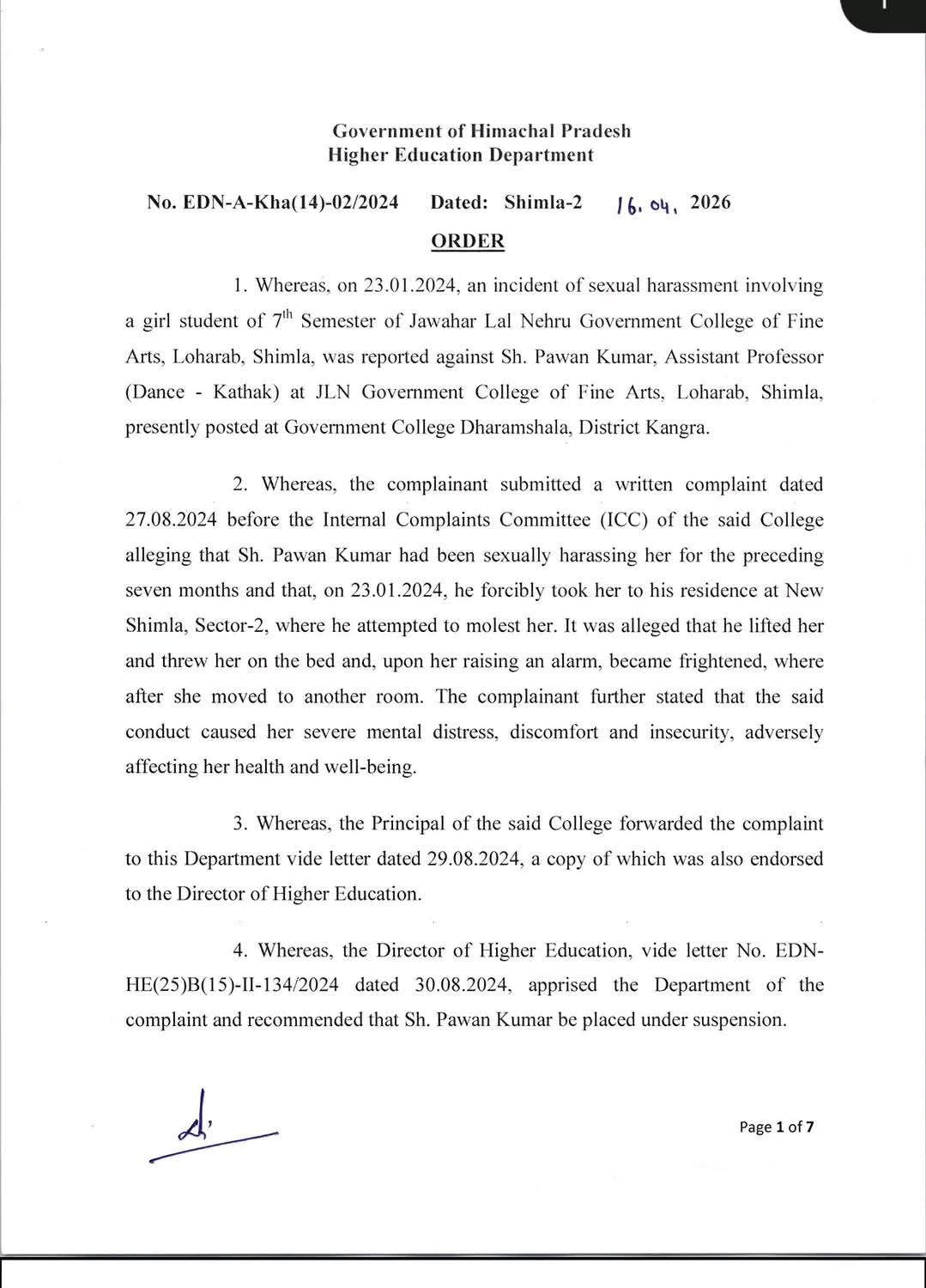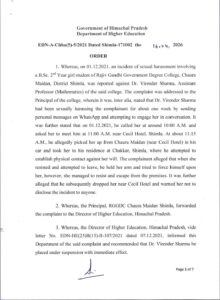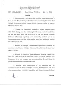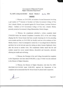 हिमाचल: प्रदेश सरकार ने यौन उत्पीड़न मामलों में तीन सहायक प्रोफेसरों की सेवाएं समाप्त कर दीं। उच्च शिक्षा विभाग की ओर से इस संबंध में आधिकारिक आदेश जारी किए गए हैं। यह कार्रवाई नादौन कॉलेज (हमीरपुर), चौड़ा मैदान कॉलेज (शिमला) और फाइन आर्ट्स कॉलेज (शिमला) से जुड़े मामलों में जांच पूरी होने के बाद की गई है। अनिल कुमार सहायक प्रोफेसर (रसायन विज्ञान) राजकीय महाविद्यालय नादौन, वीरेंद्र शर्मा सहायक प्रोफेसर (गणित) राजीव गांधी डिग्री कॉलेज चौड़ा मैदान शिमला और पवन कुमार सहायक प्रोफेसर (डांस-कथक) फाइन आर्ट कॉलेज चौड़ा मैदान शिमलामें तैनात थे। इन तीनों को अपने-अपने कॉलेजों में छात्राओं के साथ यौन उत्पीड़न का दोषी पाया गया है। इसके बाद, सेक्रेटरी एजुकेशन राकेश कंवर ने पवन कुमार, अनिल कुमार और वीरेंद्र शर्मा को बर्खास्त कर दिया।