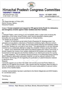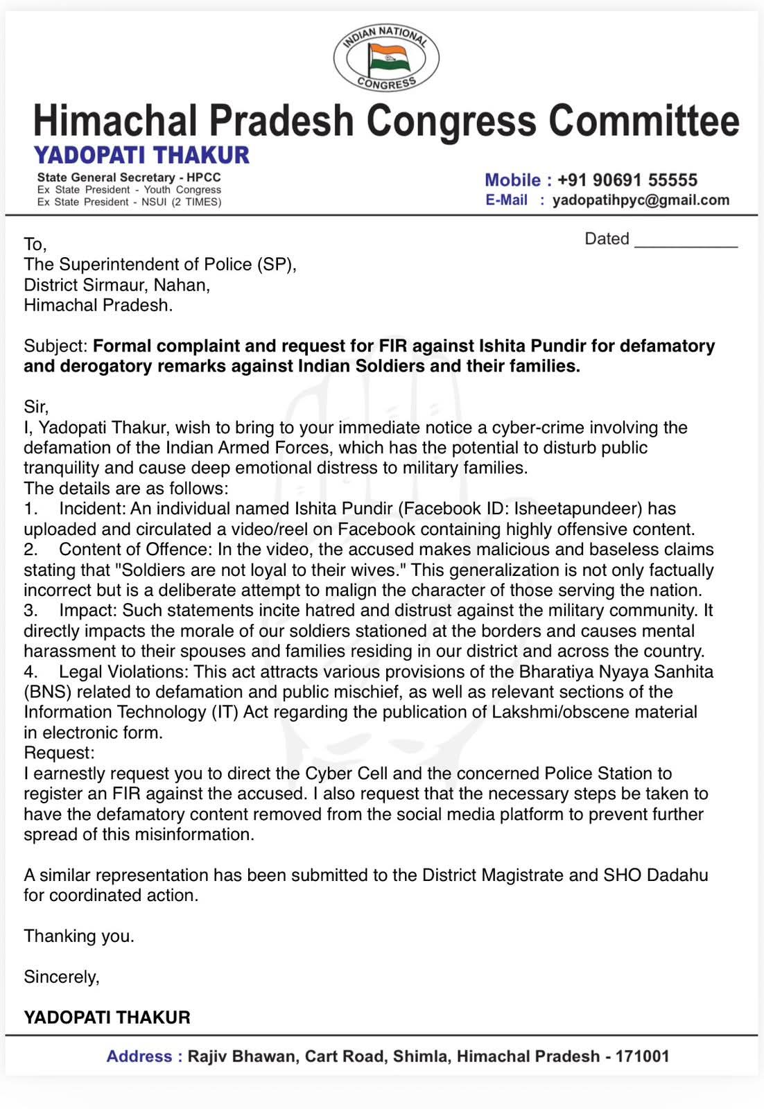 सिरमौर : जिला सिरमौर की एक इन्फ्लुएंसर के खिलाफ एफआईआर दर्ज की गई है। नौहराधार तहसील के देवा मानल गांव की सोशल मीडिया इन्फ्लुएंसर इशिता पुंडीर पर भारतीय सेना के जवानों पर टिप्पणी करने का आरोप है। इस वीडियो के वायरल होने पर देशभर से प्रतिक्रिया आने लगी तो इशिता ने अपने फेसबुक पेज से इसे डिलीट कर दिया। लेकिन तब तक यह वीडियो सैकड़ो बार बार शेयर हो चुका था तथा कई लोगों ने इसे डाउनलोड कर सबूत के तौर पर रख लिया इसके बाद इशिता पुंडीर ने एक अन्य वीडियो बनाकर फौजियों से माफी भी मांगी। गुरुवार को राजगढ़ पुलिस थाना में पहुंचकर भूतपूर्व सैनिक संगठन राजगढ़ के पदाधिकारियों ने इशिता पुंडीर द्वारा फौजियों के खिलाफ अभद्र टिप्पणी करने के मामले में शिकायत दर्ज करवाई। साथ ही इशिता पुंडीर के अकाउंट की भी जांच की मांग की।वहीं, सरकाघाट में हिमाचल कांग्रेस महासचिव यदोपति ठाकुर की शिकायत पर भी एफआईआर दर्ज कर ली गई है।
