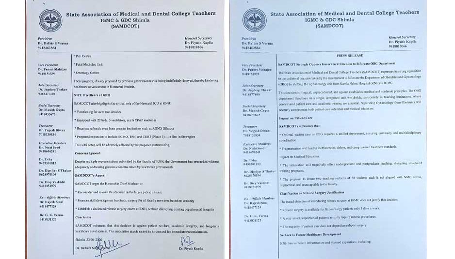 शिमला: स्टेट एसोसिएशन ऑफ मेडिकल एंड डेंटल कॉलेज टीचर्स (SAMDCOT) ने कमला नेहरू अस्पताल (KNH) से इंदिरा गांधी मेडिकल कॉलेज (IGMC) में स्त्री रोग (Gynaecology) इकाई को स्थानांतरित करके प्रसूति एवं स्त्री रोग (OBG) विभाग को विभाजित करने के सरकार के एकतरफा निर्णय पर गहरा विरोध व्यक्त किया है।