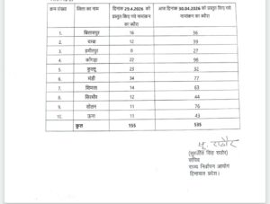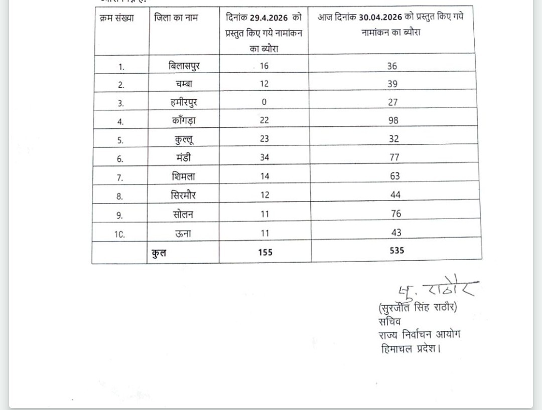 हिमाचल: राज्य निर्वाचन आयोग हिमाचल प्रदेश द्वारा 51 शहरी निकायों के सामान्य निर्वाचन हेतु दिनांक 21 अप्रैल को अधिसूचना जारी की थी। निर्वाचन कार्यक्रम के अनुसार आज दिनांक 30 अप्रैल को नामांकन पत्र भरने का दूसरे दिन था। 2 मई को भी नामांकन पत्र प्रस्तुत किए जाएँगे। इन नामांकन पत्रों की जांच पंड़ताल 4 मई, 2026 को सम्बन्धित रिटर्निंग/सहायक रिटर्निंग अधिकारी प्रातः 10 बजे के उपरान्त करेंगे। चुनाव में भाग लेने वाले उम्मीदवारों को 06 मई, 2026 को ही नामांकन पत्रों की वापिसी के तुरन्त पश्चात् चुनाव चिन्ह आबंटित किए जाएँगे। मतदान 17 मई, 2026 को प्रातः 7 बजे से सांय 3 बजे तक ई.वी.एम. के माध्यम से करवाया जाएगा। आज नामांकन पत्र प्रस्तुत करने के द्वितीय दिन कुल 535 नामांकन पत्र प्राप्त हुए। जिला काँगड़ा में सबसे अधिक 98 नामांकन प्राप्त हुए जबकि जिला हमीरपुर में सबसे कम 27 नामांकन पत्र प्रस्तुत किए गये। जिलावार प्रस्तुत किए:-