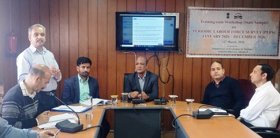 शिमला: आर्थिक एवं सांख्यिकी विभाग द्वारा आवधिक श्रम बल सर्वेक्षण (पीएलएफएस) के अंतर्गत क्षेत्रीय कार्मिकों के लिए आज शिमला में दो दिवसीय राज्य स्तरीय कार्यशाला का आयोजन किया गया। यह कार्यशाला सांख्यिकी एवं कार्यक्रम कार्यान्वयन मंत्रालय भारत सरकार के दिशा-निर्देशों के अनुरूप आयोजित की गई।